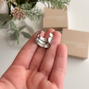Los anillos personalizados de Capitanna están diseñados para transformar un momento especial en una joya única. Puedes grabar nombres, fechas o frases con significado, creando un anillo que represente una historia personal.