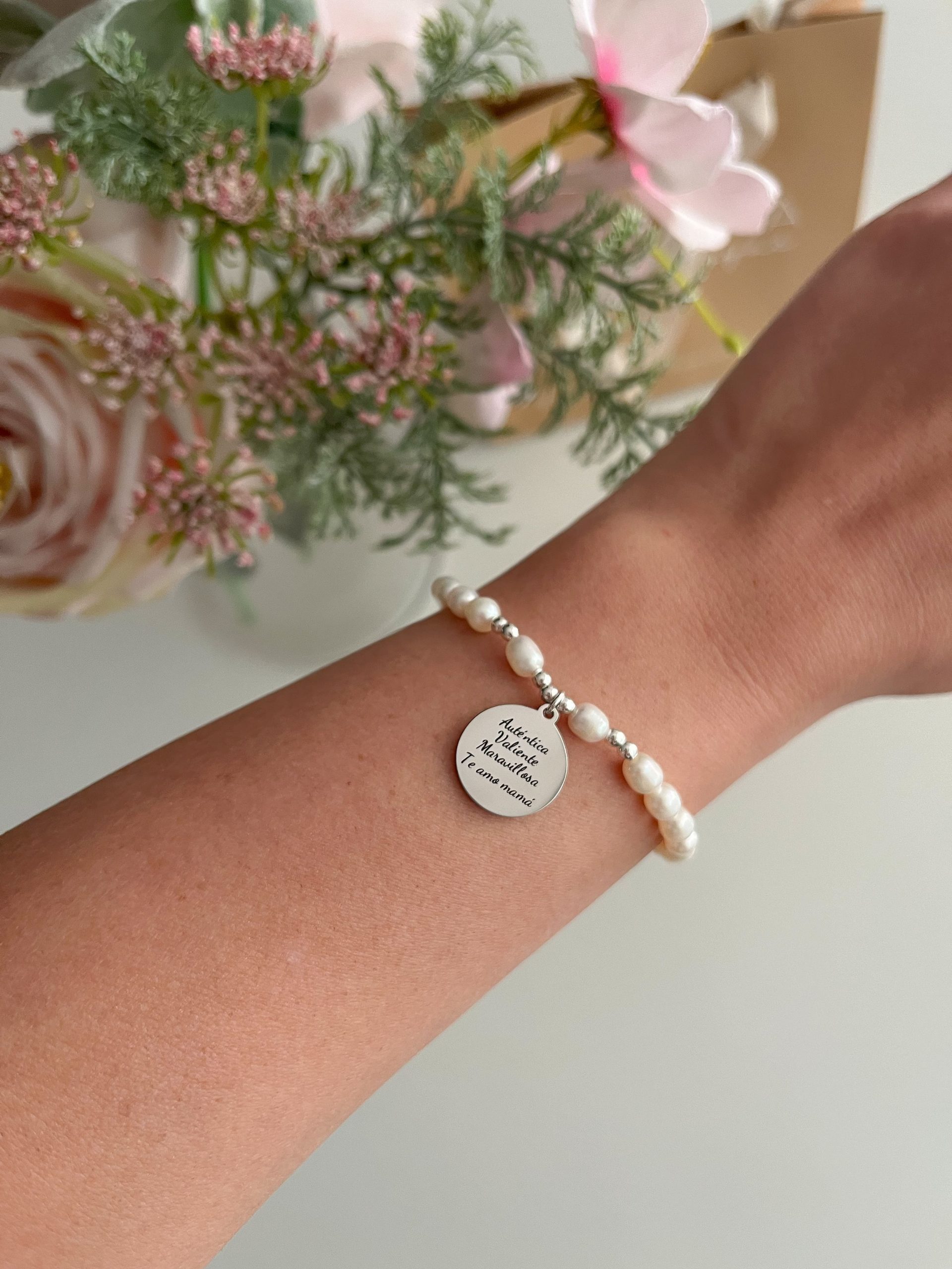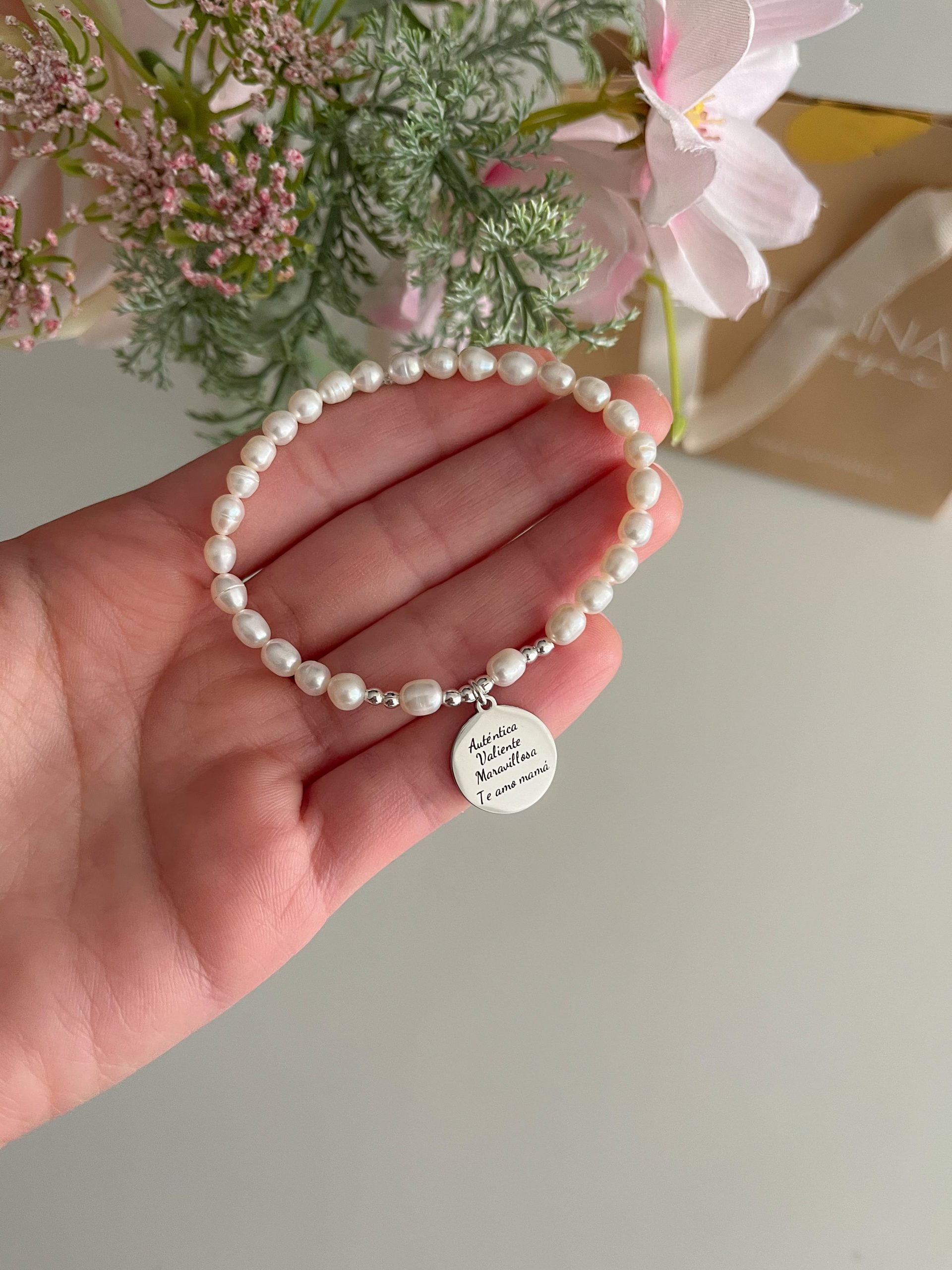 Pulsera de perlas Naturales con dije personalizado donde puedes grabar lo que tu quieras: frase, nombre, dibujo, escrito a mano, grabado de imagen, etc.